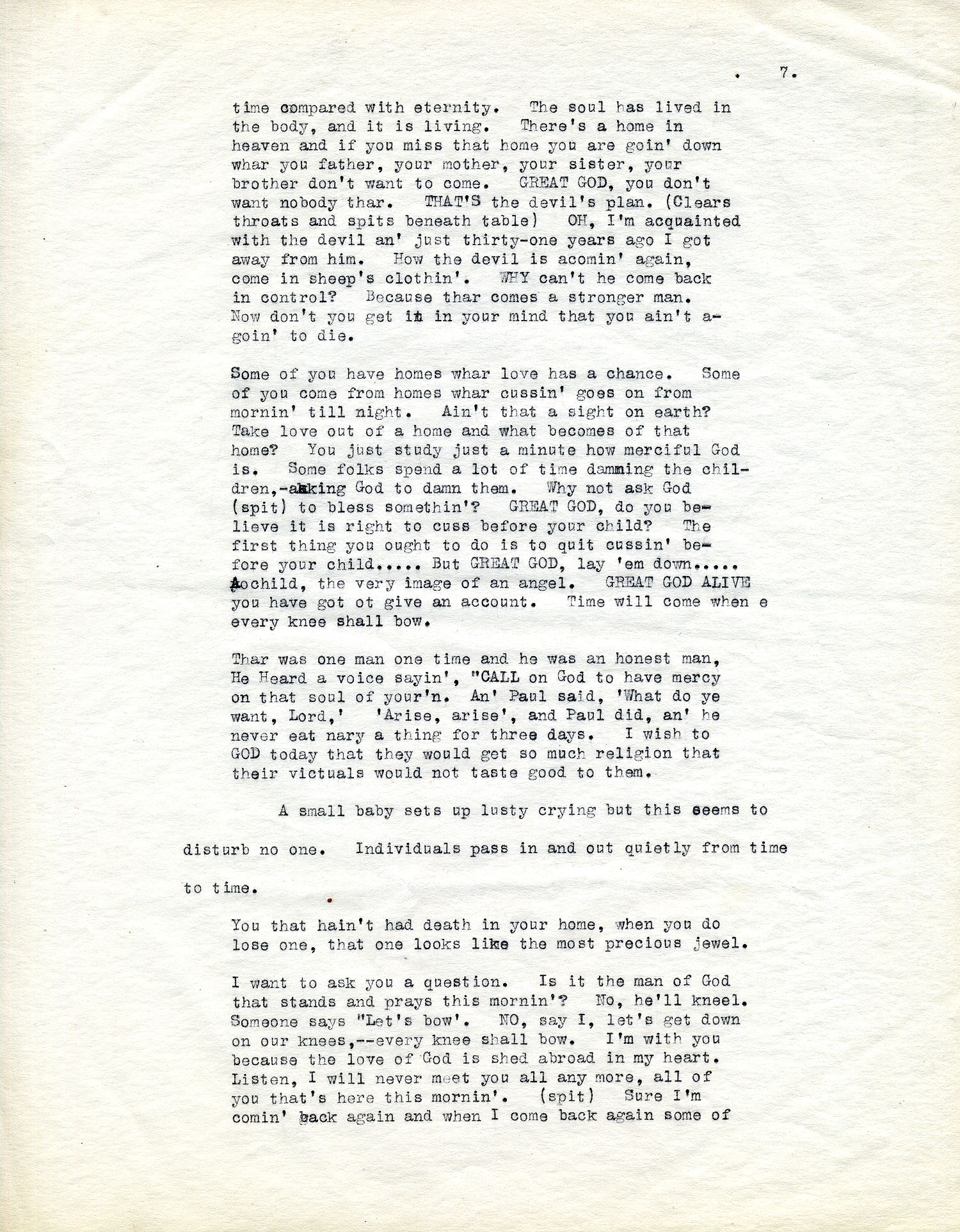 Some of you have homes whar love has a chance. Some of you come from homes whar cussin’ goes on from mornin’ till night. Ain’t that a sight on earth? Take love out of a home and what becomes of that home? You just study just a minute how merciful God is. Some folks spend a lot of time damning the children, –asking God to damn them. Why not ask God (spit) to bless somethin’? GREAT GOD, do you believe it is right to cuss before your child? The first thing you ought to do is to quit cussin’ before your child….. But GREAT GOD, lay ’em down…. A child, the very image of an angel. GREAT GOD ALIVE you have got to give an account. Time will come when every knee shall bow.