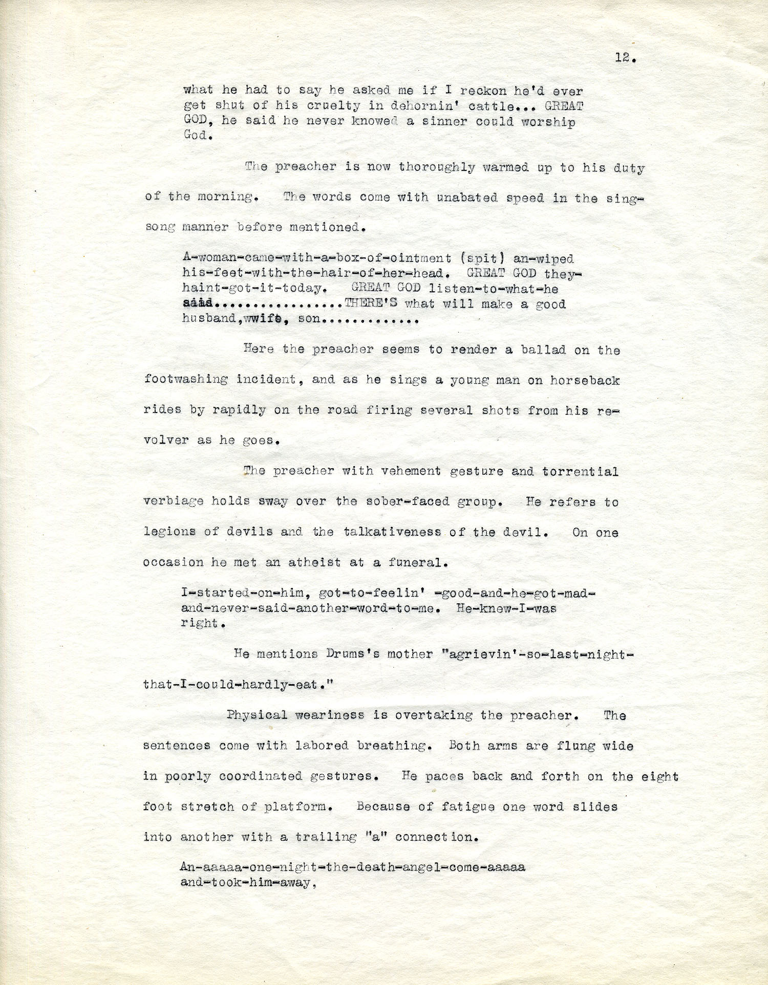 occasion he met an atheist at a funeral. “I-started-on-him, got-to-feelin’ -good-and-he-got-mad-and-never-said-another-word-to-me. He-knew-I-was right.” He mentions Drum’s mother “agrievin’-so-last-night-that-I-could-hardly-eat.”