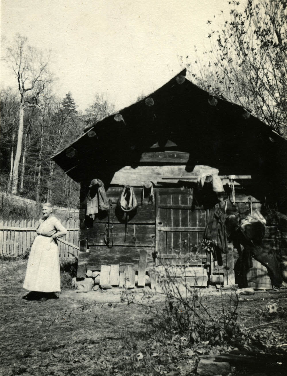 - Woman in front of log shed, with harness and miscellaneous items on wall, far view. Standing with hands on hips. FN Vl_35_1126c
