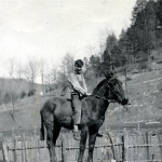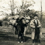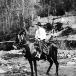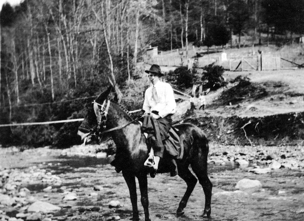 - Man on mule-back in mid-stream. Man is wearing hat and tie. FN Vl_35_1132