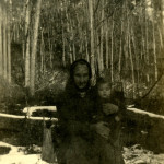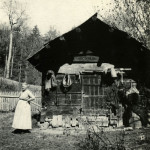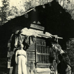 - Woman in front of log shed with harness and miscellaneous items on wall. FN Vl_35_1126a