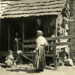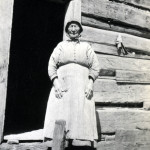 - Woman in bonnet and apron standing with hands on thighs at door of a cabin. FN Vl_35_1153