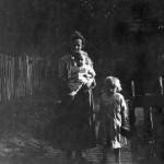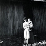 - Mallie Begley with young child in arms, standing in yard in front of doorway FN Vl_35_1127b