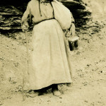 - Woman with bonnet and cane carrying lard bucket and bag. FN