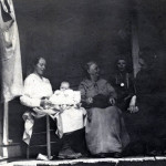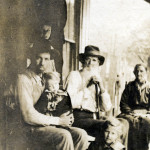 - Six people seated on porch. Man to far left holds a small child in his lap. FN Vl_35_1156