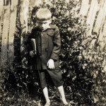 - Small very shy little boy in knickers with book tucked under his right arm. He stands in front of a picket fence and vegetation. FN Vl_35_1146