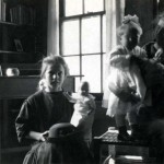 - Woman with young child and young girl to her right, holding a doll. Inside a PMSS house, worker [?] to far right. FN Vl_35_1150