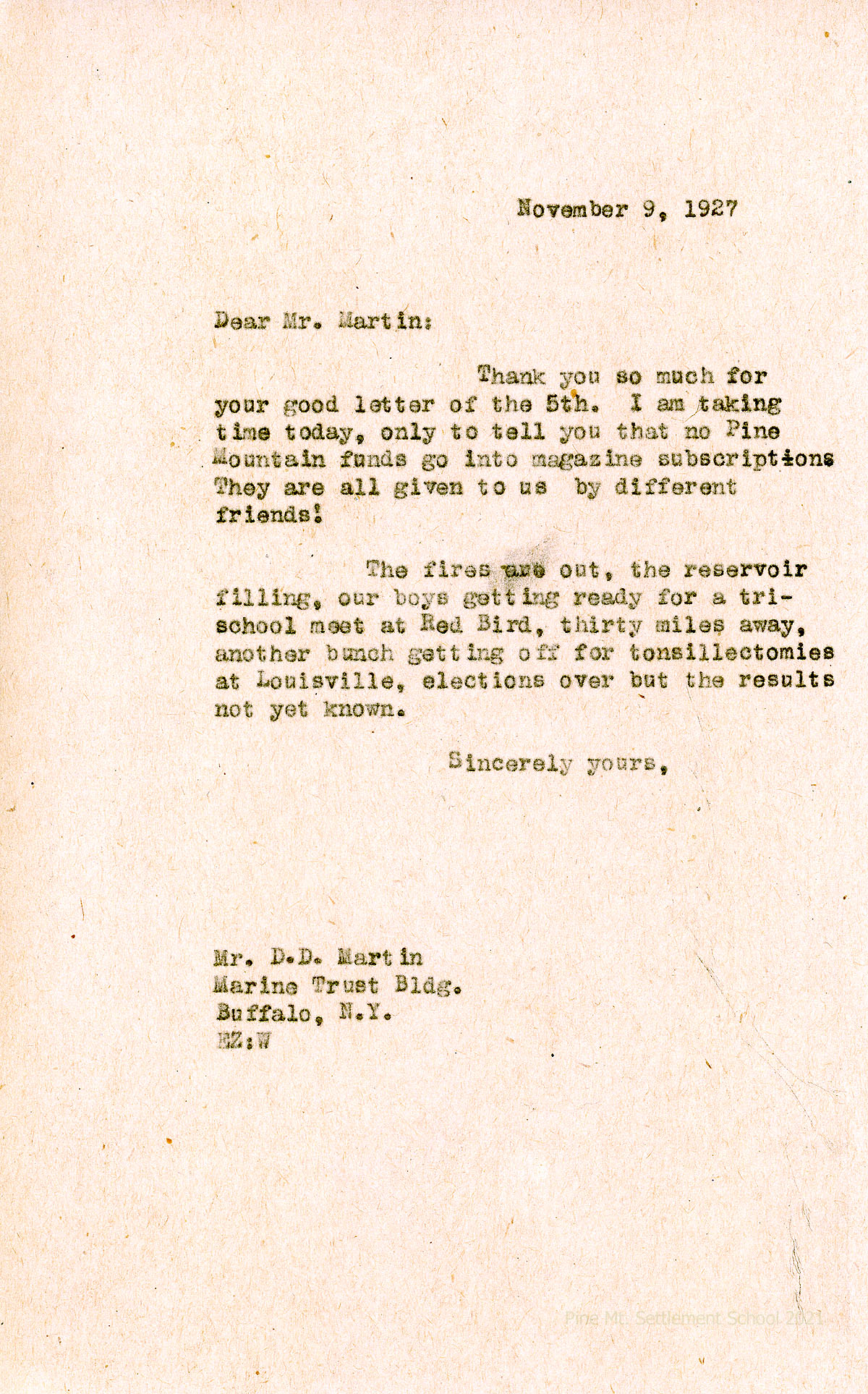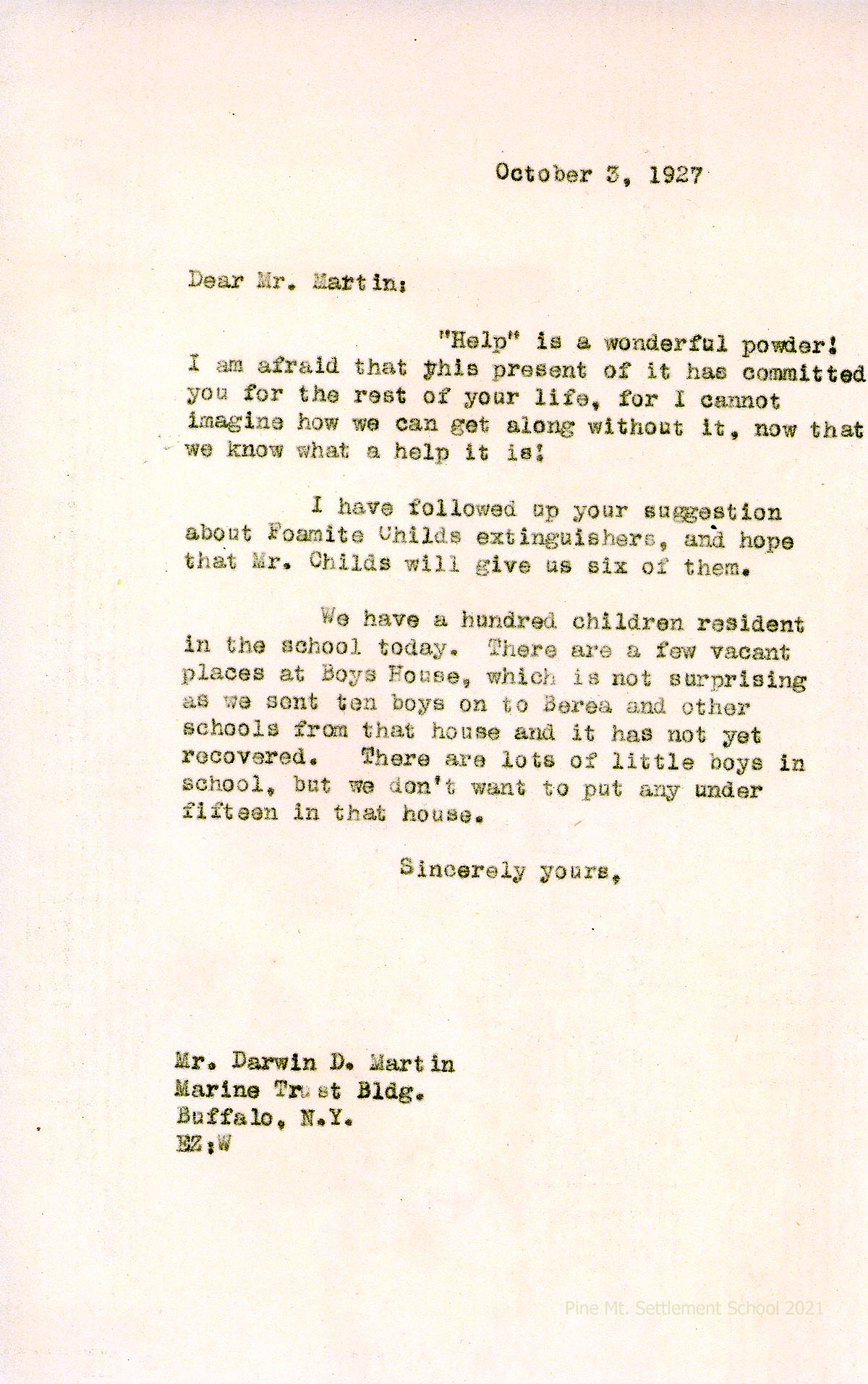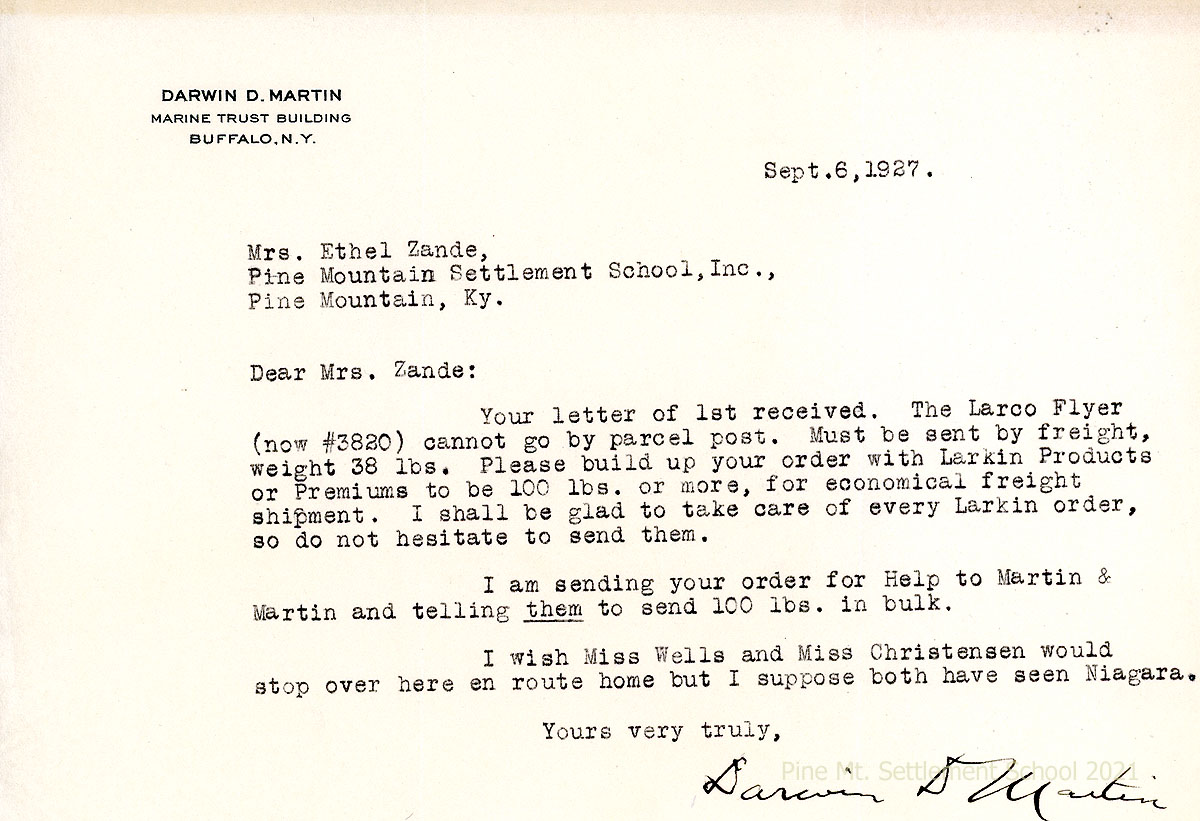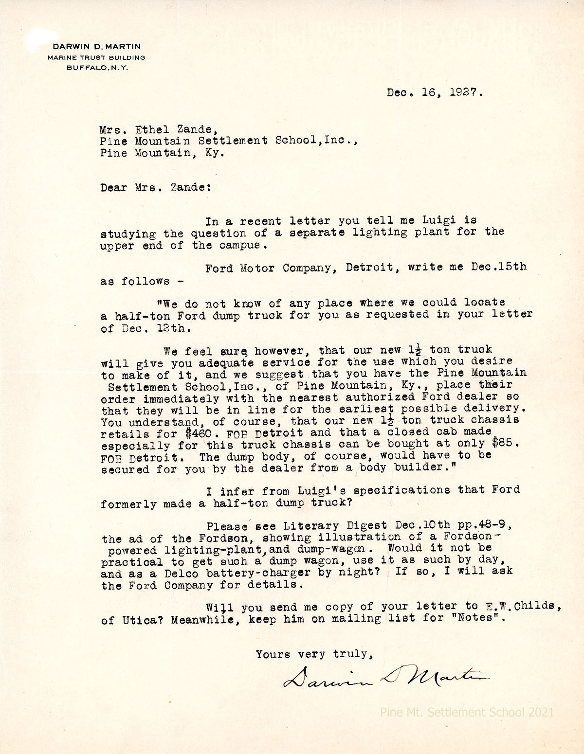 TAGS: Darwin D. Martin 1927, correspondence 2, Larkin Company, Ford dump-truck, Reservoir, Delco generator, moonlight schools, upright pianos, beechnuts, stoves, fire extinguishers, coal mine, Elizabeth Hench, Fair of the Iron Horse, American Laundry Machinery Company, Luigi Zande, forest fires, Martha Berry Schools
