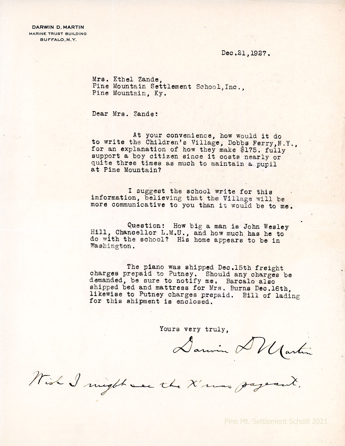 101 December 21. Martin to Mrs. Zande. Martin suggests that the School write to the Children’s Village in Dobbs Ferry, NY, and ask them how they support a “boy citizen” on $175 when it costs around three times as much at PMSS. Asks about John Wesley Hill, Chancellor L.M.U. Gives details about recent shipments of piano and items for Mrs. Burns’ cabin.