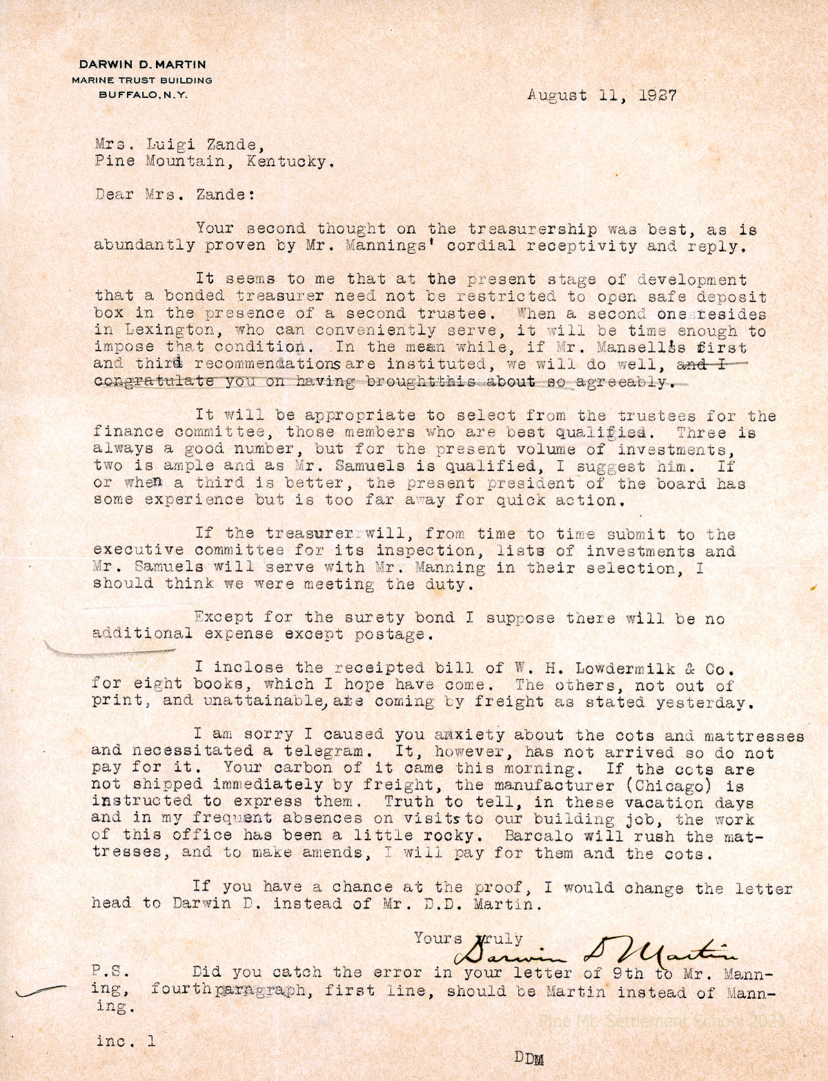 [Note: Letters from PMSS staff in the PMSS Collections are carbon copies, typewritten, unsigned, and meant for the Office files.The original signed copies were sent to the correspondents. The initials at the bottom left of most PMSS letters indicate the writer (along with initials of the secretary). For example, “EZ” are the initials for Ethel de Long Zande, “KP” refers to Katherine Pettit, and “LZ” to Luigi Zande. Letters from Darwin D. Martin are typewritten on a letterhead with his address at “Marine Trust Building, Buffalo, NY.” The following list of contents is in chronological order and not necessarily in the order of the image numbers.]