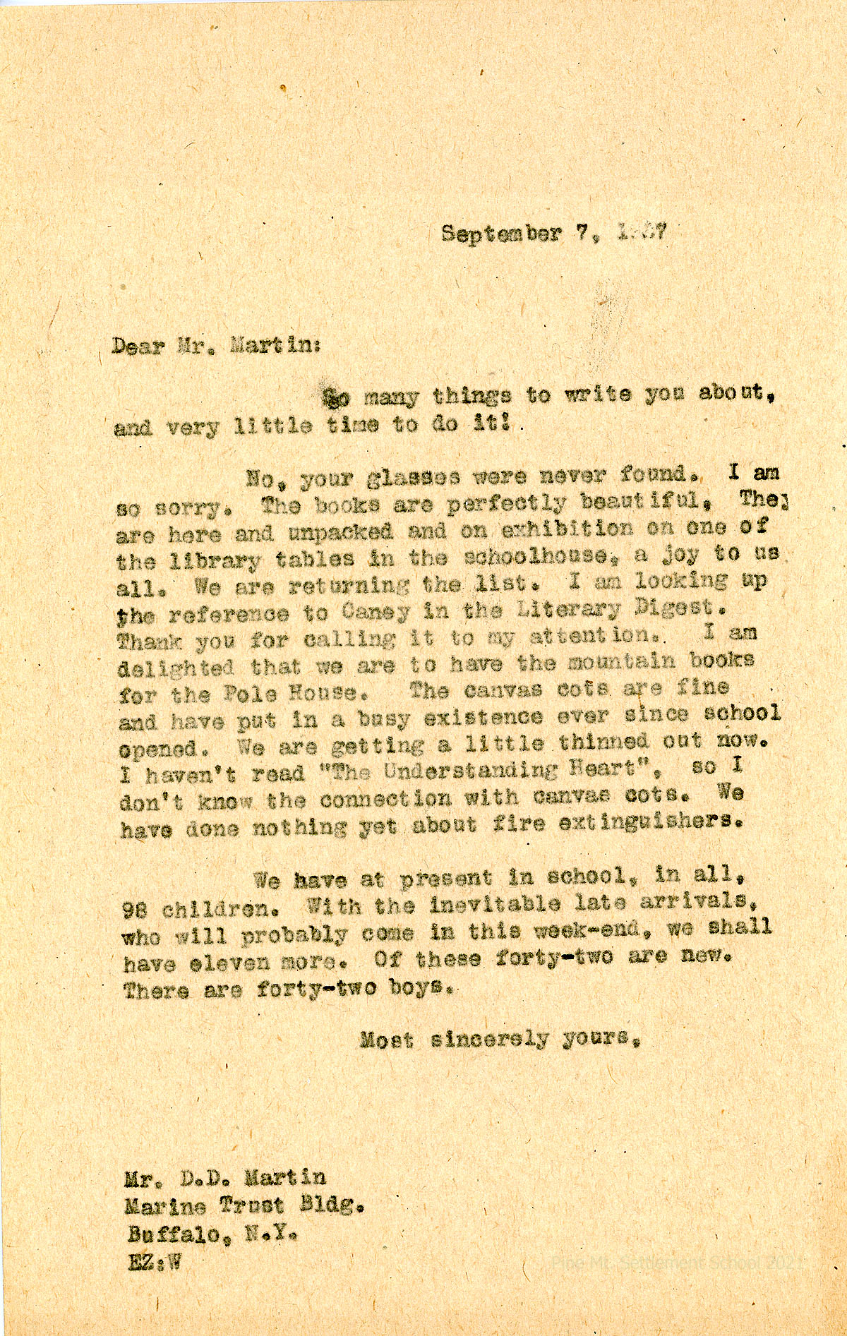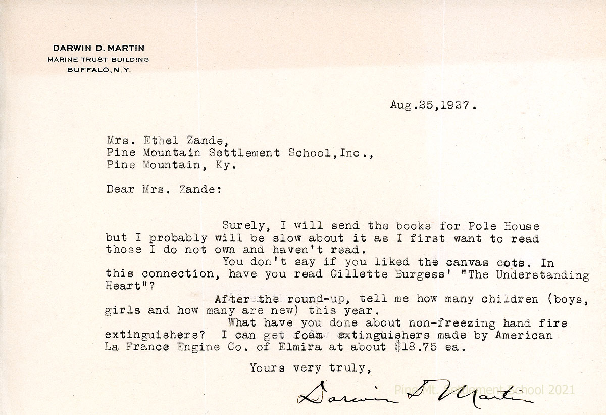 060 August 25. Martin to Mrs. Zande. He will be sending books for Pole House; suggests Gillette Burgess’ The Understanding Heart; asked for the number of students this year; offers to get foam fire extinguishers from American La France Engine Co. in Elmira, NY.