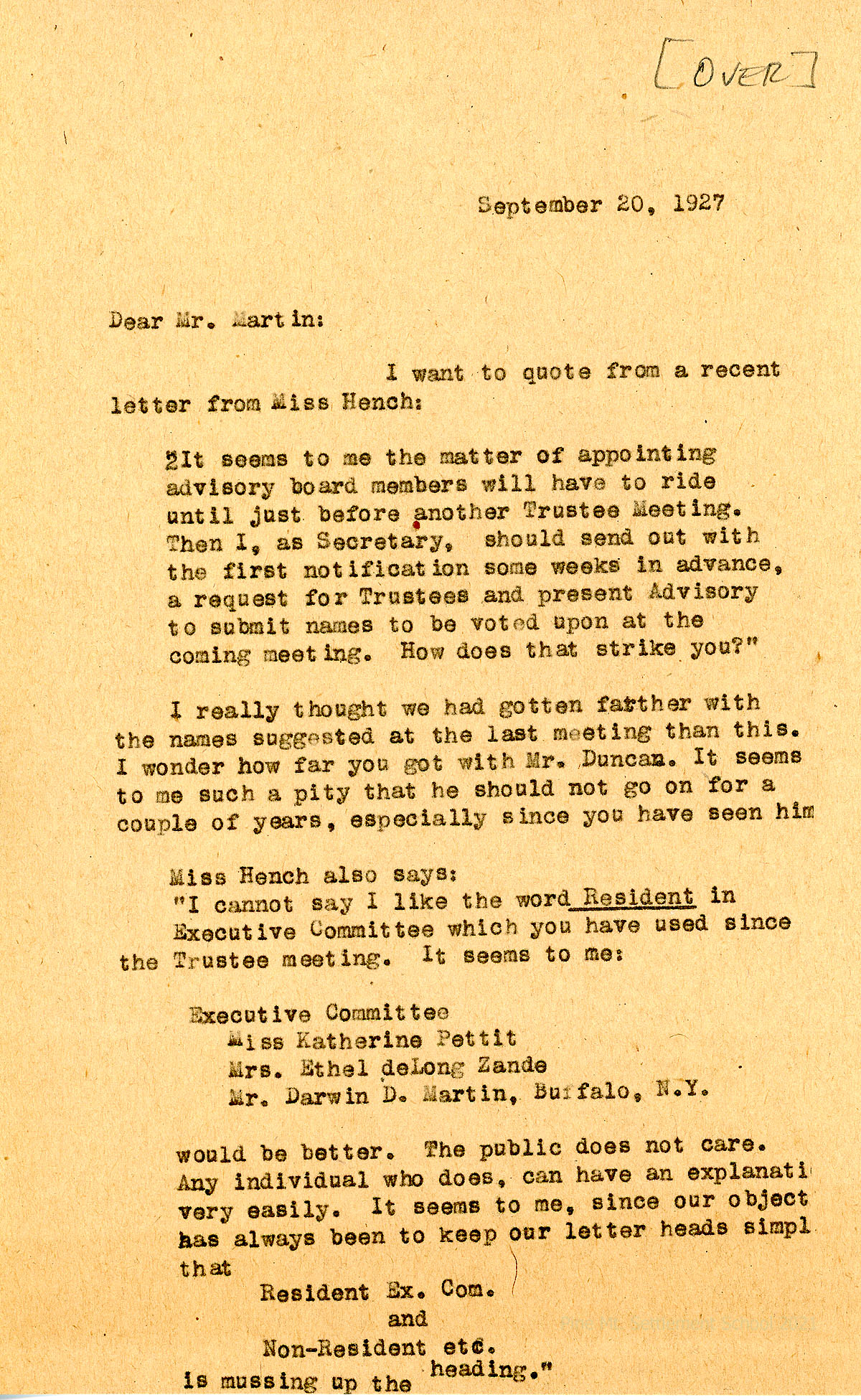070 September 20. (Truncated, likely Zande) to Martin with an excerpts from Miss (Elizabeth) Hench’s (trustee) letter about appointing advisory board members; objects to using the word “Resident” in “Executive Committee” in PMSS letterhead.