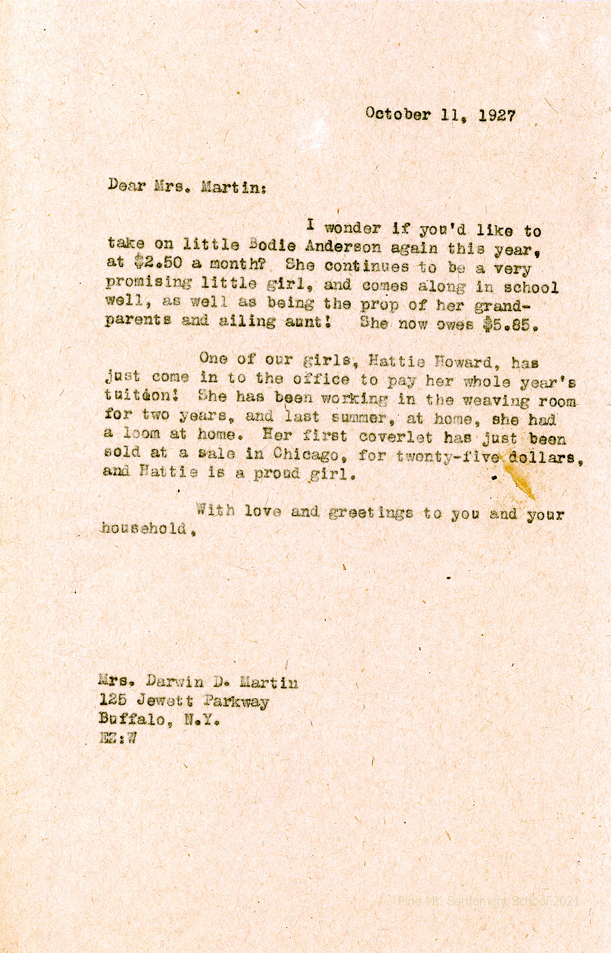 [077] October 11. EZ (Zande) to Martin, asking if he will continue sponsoring “little Bodie Anderson” this year at $2.50 a month. “She continues to be a very promising little girl, and comes along in school well, as well as being the prop of her grandparents and ailing aunt!” Hattie Howard just paid her whole year’s tuition; is interested in weaving.