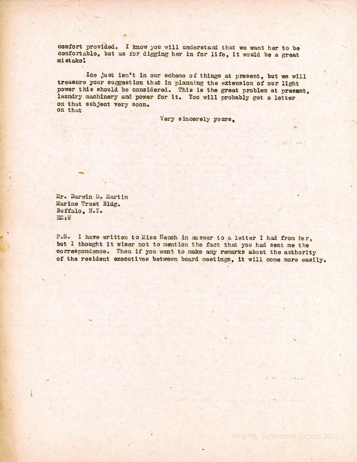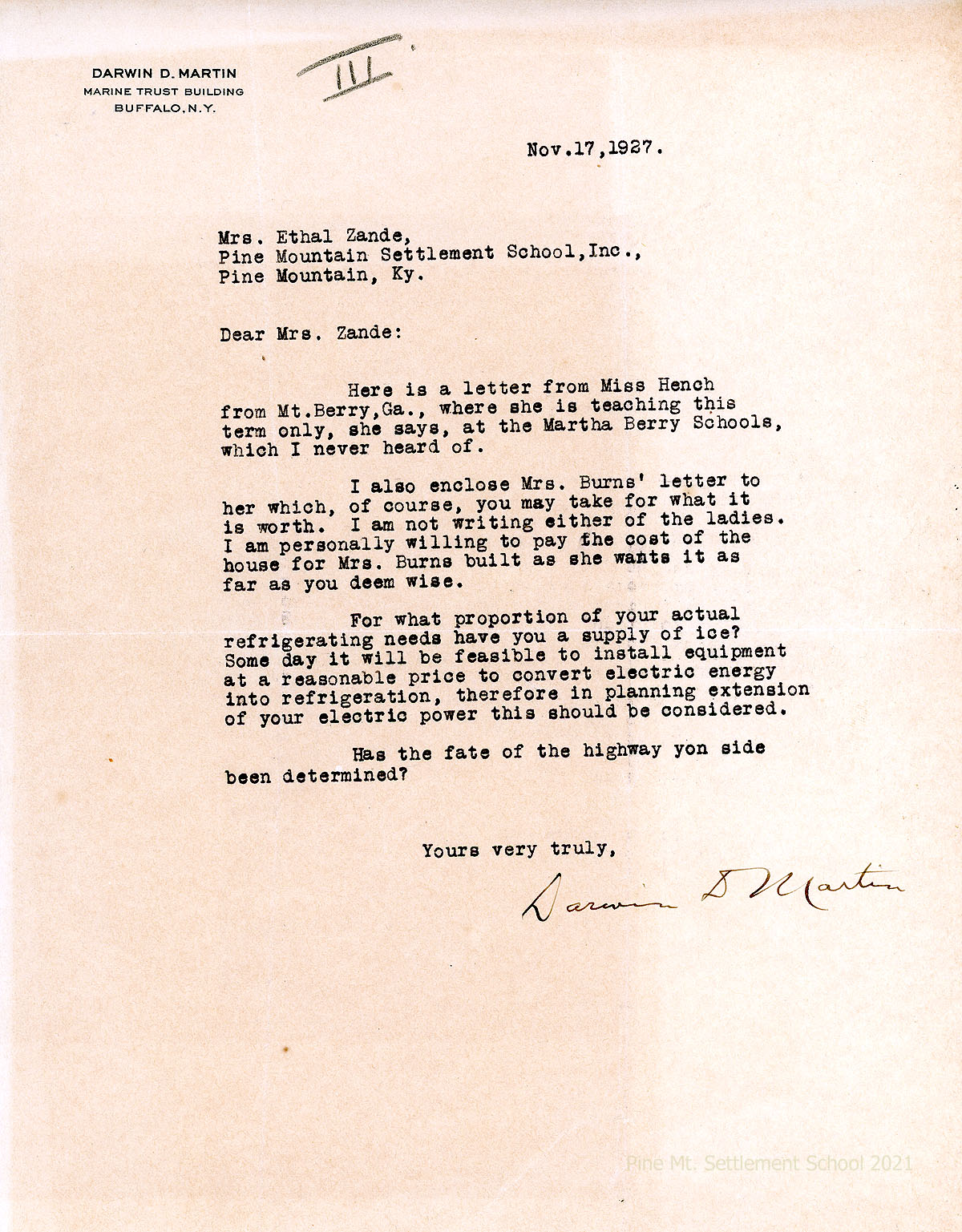 086 November 17. Martin to Mrs. Zande, enclosing “a letter from Miss Hench from Mt. Berry, Ga., where she is teaching this term only…at the Martha Berry Schools.” He suggests, when extending PMSS’s electric power, she should consider converting “electric energy into refrigeration” instead of using ice.