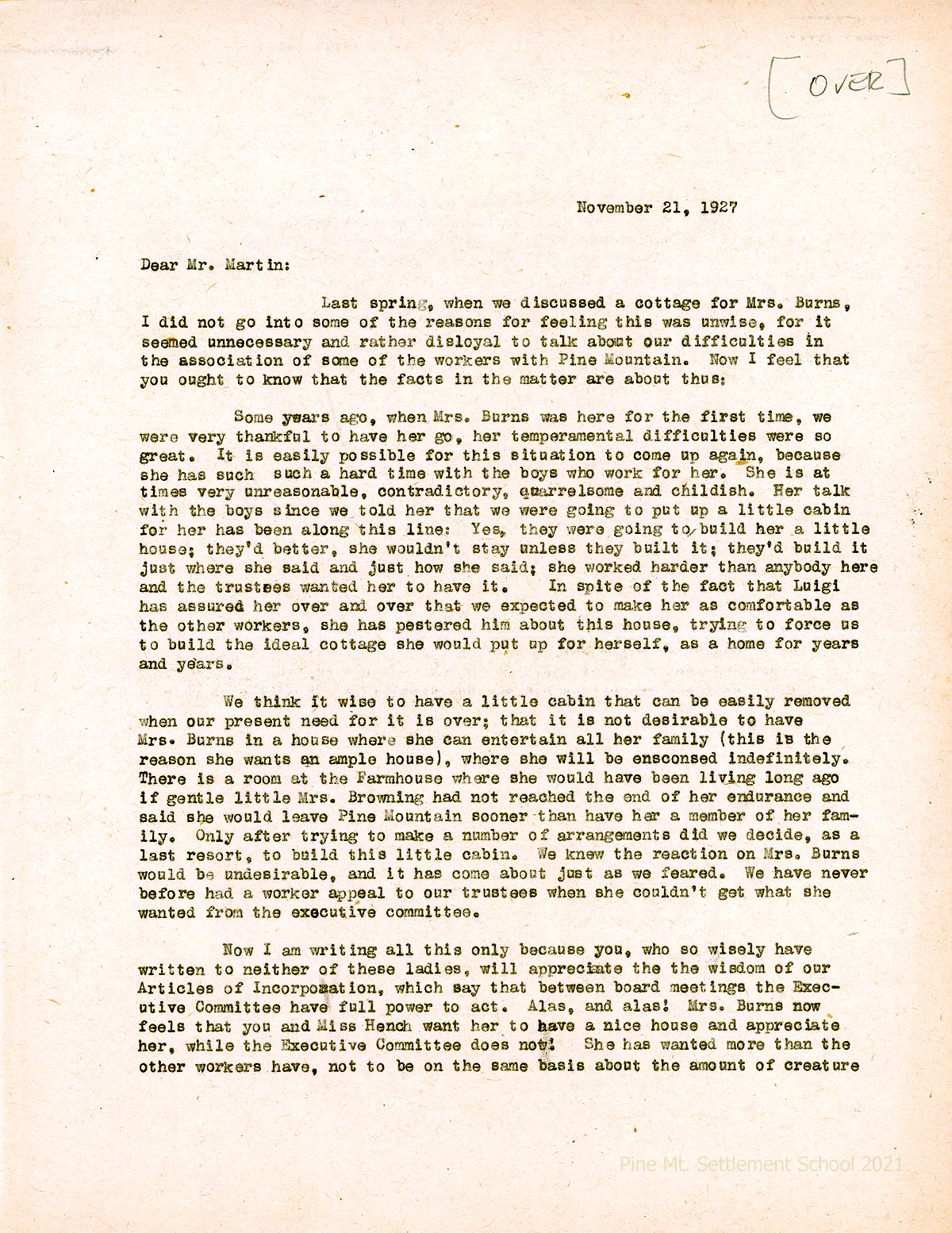087-088 November 21. EZ (Zande) to Martin, presenting to him the reasons she feels a cottage for Mrs. Burns would be “unwise,” thinking instead of a small temporary cabin.