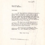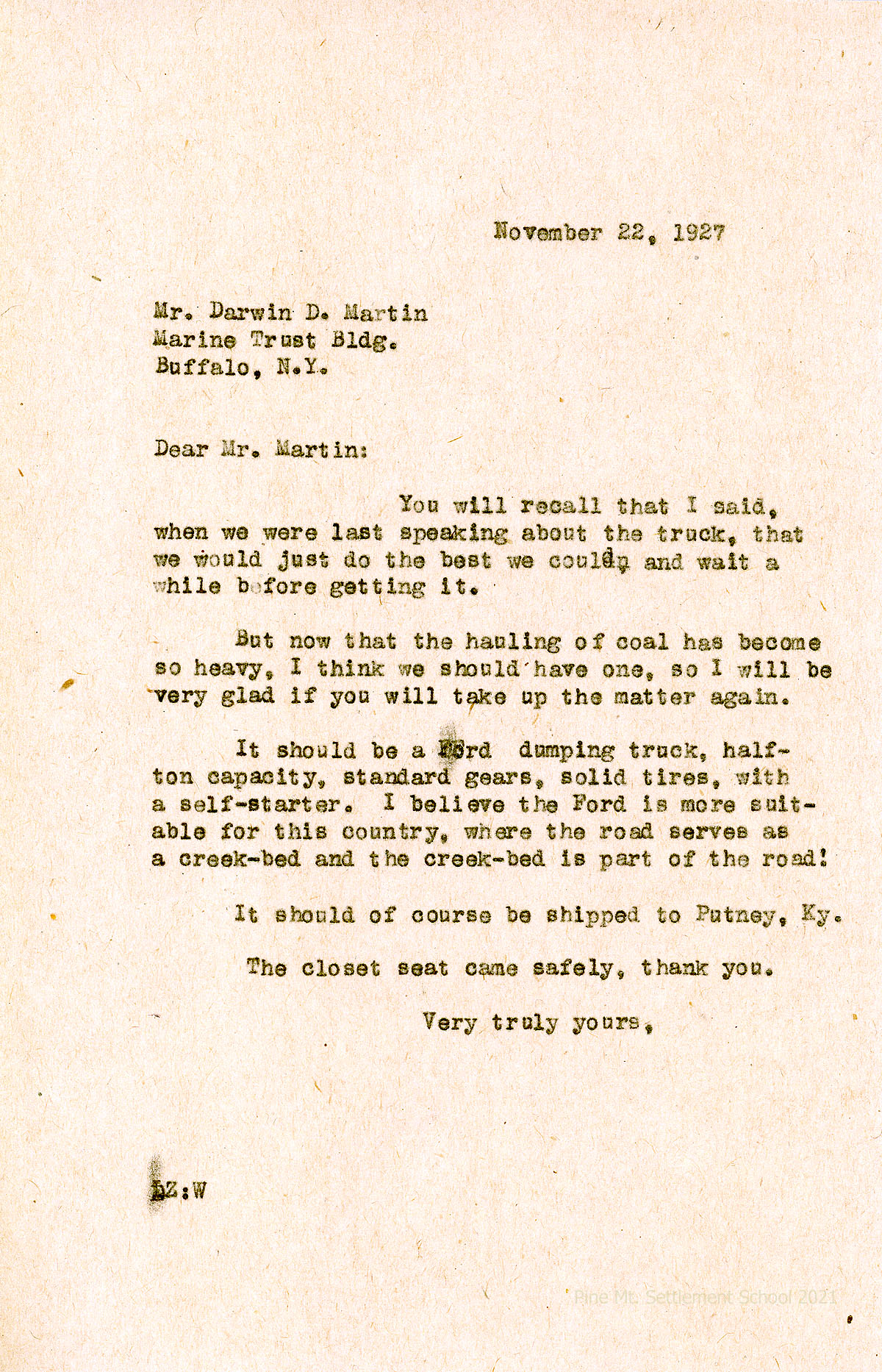 098 December 12. Unsigned (apparently Martin) copy to PMSS of a letter to Ford Motor Co., Detroit, MI. As president of the PMSS Board of Trustees, he describes difficulty in finding the type of truck the School needs. “The school is located where there are practically no roads and hauling is difficult. The school has its own coal mine and desires the truck principally for hauling coal….” Martin asks for help in finding a proper truck.