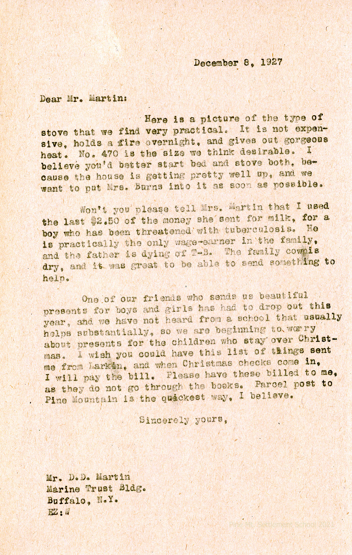 093 December 8. EZ (Zande) to Martin, sending a picture of the type of heating stove for Mrs. Burns’ cabin. The last of Mrs. Martin’s money she sent for milk went to a boy whose needs she then describes. The staff is worried about presents for the children who stay over Christmas, since two donors have dropped out. She encloses an order for things from Larkin Co., which Zande will pay for personally.
