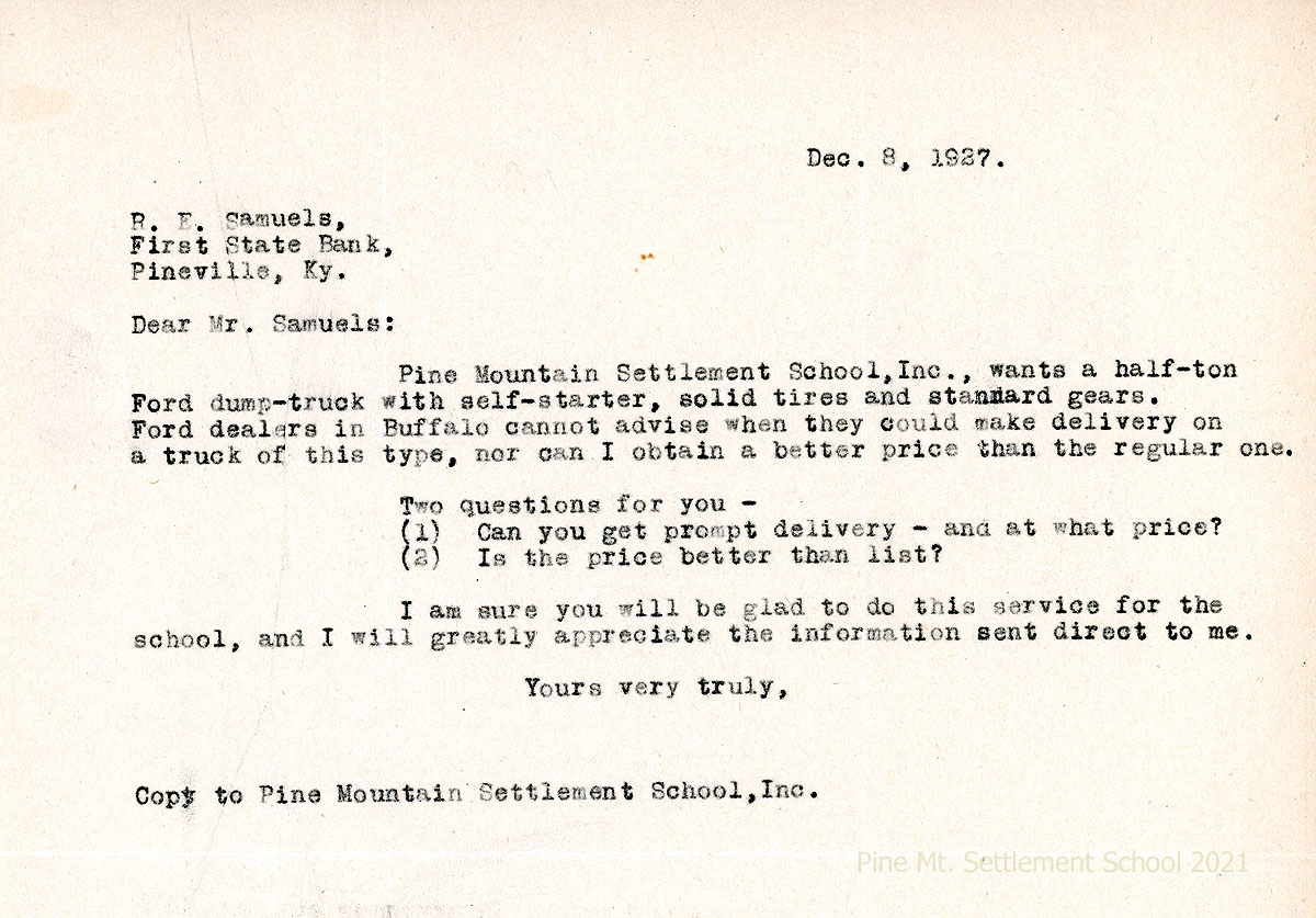 096 December 8. Unsigned copy to PMSS of a letter to R. E. Samuels, First State Bank, Pineville, KY, asking the price and delivery schedule for a Ford dump-truck for Pine Mountain Settlement School.