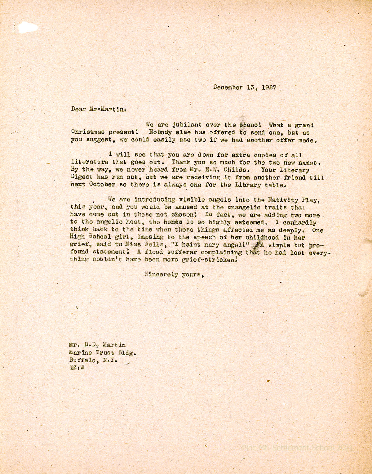 097 December 13. Unsigned (likely Zande) to Martin. Zande is “jubilant over the piano!” Extra copies of all literature will go to Martin; no news from Mr. E.W. Childs; about the Literary Digest subscription. “We are introducing visible angels into the Nativity Play this year and you would be amused at the unangelic traits that have come out in those not chosen!” Zande provides an anecdote as an example.
