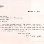081 October 29. Martin to Mrs. Zande, enclosing a $200 check toward the house for Mrs. [Martha] Burns and asked what equipment he can send; expects to help finance other installations. Asks how Mr. Zande is increasing “hauling capacity,” such as mules. A guide book had erroneously listed Laden as the shipping destination for PMSS; he will correct that to Putney. He thanks Zande for the “news for Board Members” and hope it will become a long series. Suggests using testimonials of patrons in the School’s “Notes” to advertise the School.