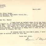 095 December 9. Martin to Mrs. Zande, who is sending PMSS an upright piano in a golden oak case.