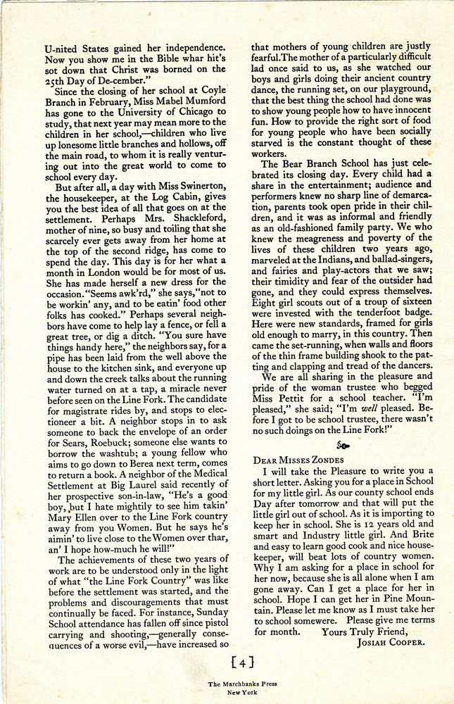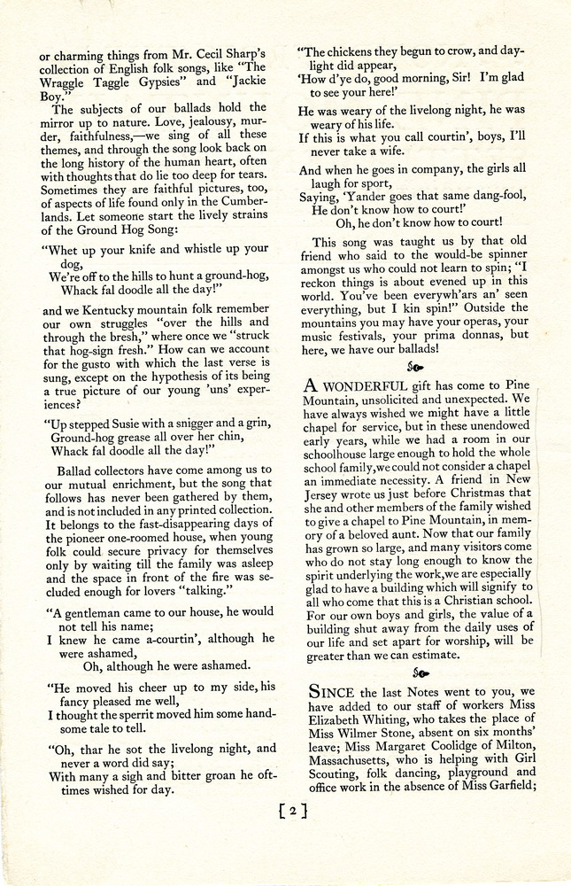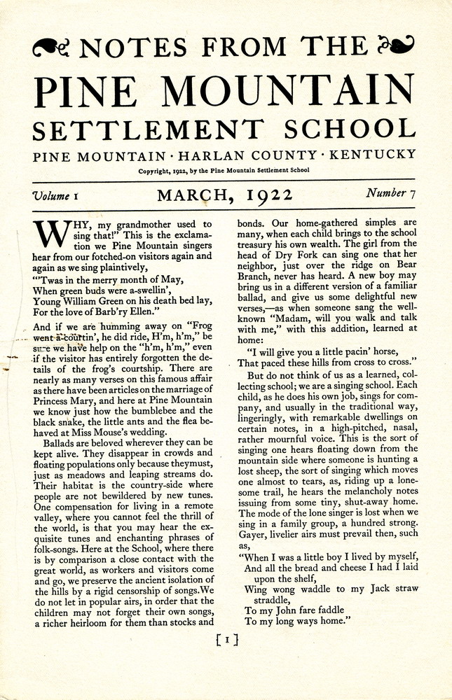 NOTES – 1922 MARCH: ballads ; lyrics ; Chapel ; donation ; letter from Josiah Cooper ; Elizabeth Whiting ; Wilmer Stone ; Margaret Coolidge ; Frances Gilbert ; Mrs. James J. Storrow ; J.H. Duncan ; Cecil Sharp ; Miss Katherine Pettit ; Miss Garfield ; Florence Reeves ; Girl Scouts ; scholarships ; Kitty Ritchie ; Allie Callahan ; Endowment Fund ; dancing ; Marguerite Butler ; Line Fork Settlement ; Miss Anne Pavey ; Miss Medcalf ; Mabel Mumford ; Miss Swinerton ; Bear Branch School ; Coyle Branch ; the Log Cabin ;