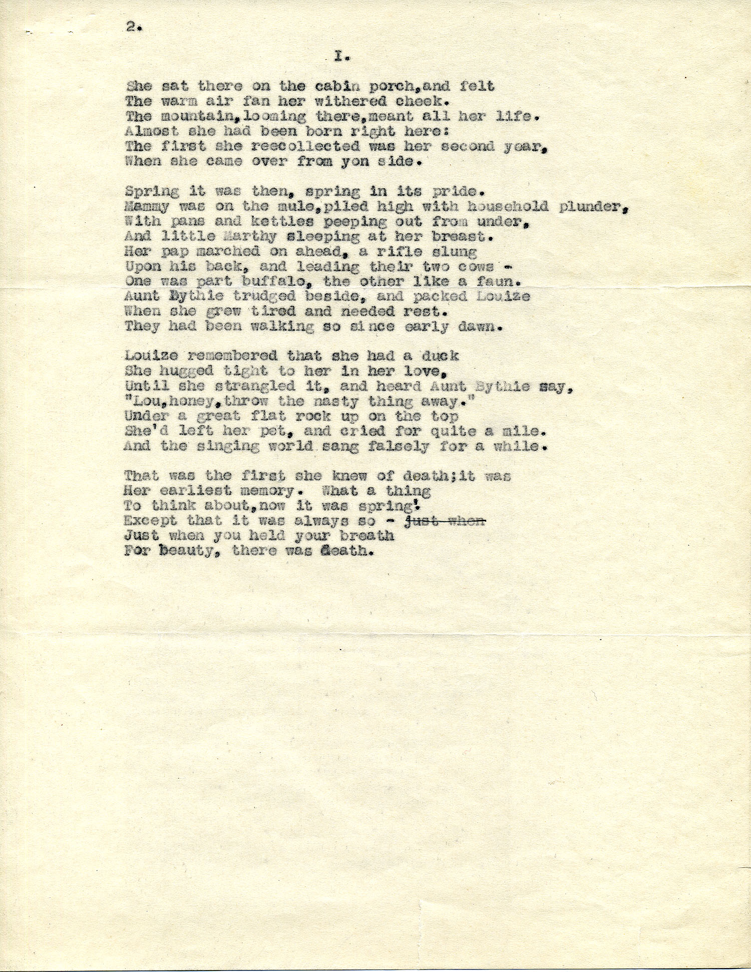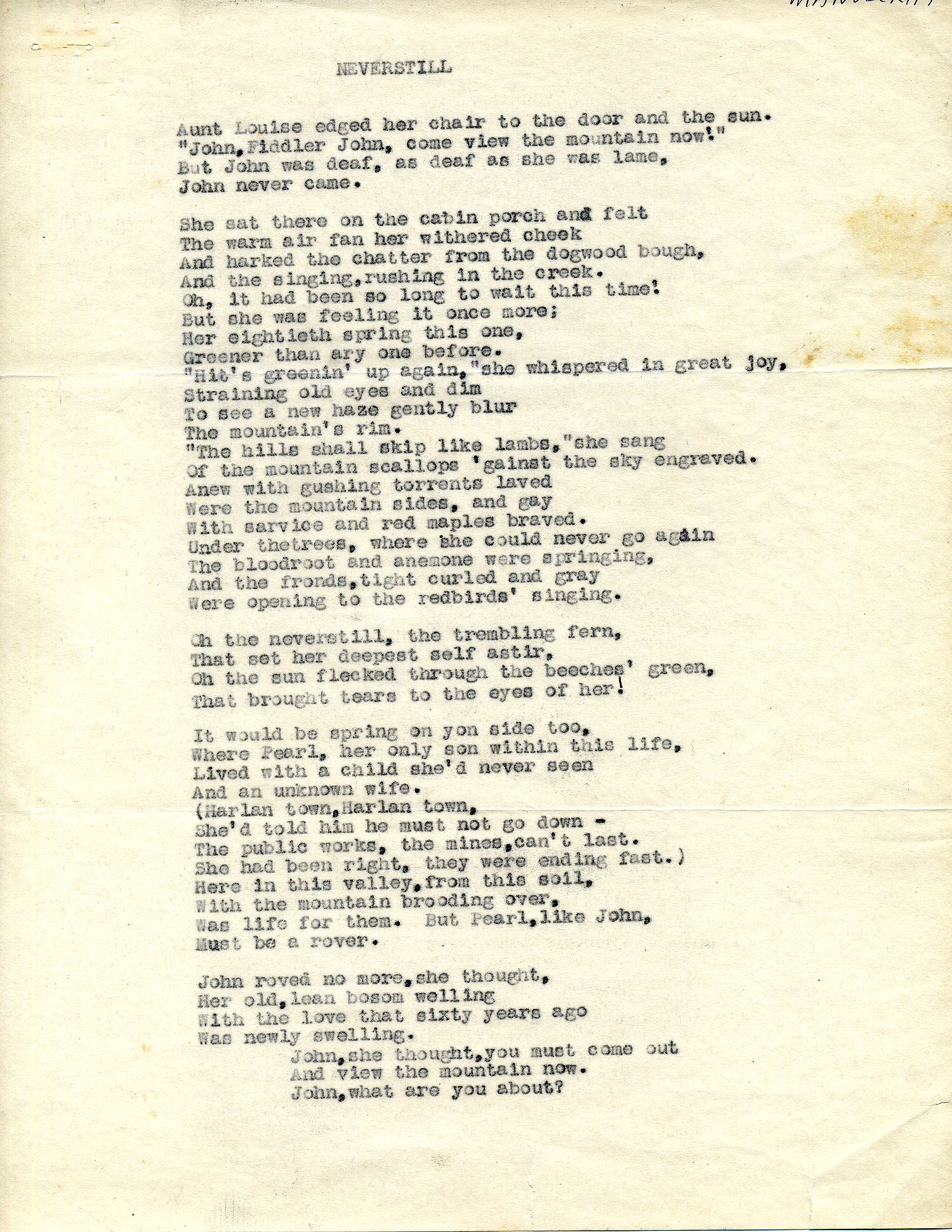 Sally Loomis’s life was one that quite clearly reflects her interest in social justice, her concern for the poor and disadvantaged, and her devotion to the craft of journalism. Her poem “Neverstill” is a rich tapestry of Appalachian influences and many of the later themes of her life.