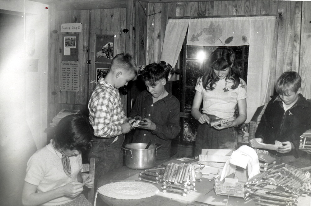 The images from the Community School days depict classroom activities and craft programs integrated into the curriculum and also offered after school hours. The activities depicted include woodworking, sewing, weaving, and other activities as captured by various unidentified photographers. Also included are selected images of students from the kindergarten school that was known as “Little School,” run by Pine Mountain in cooperation with Head Start.