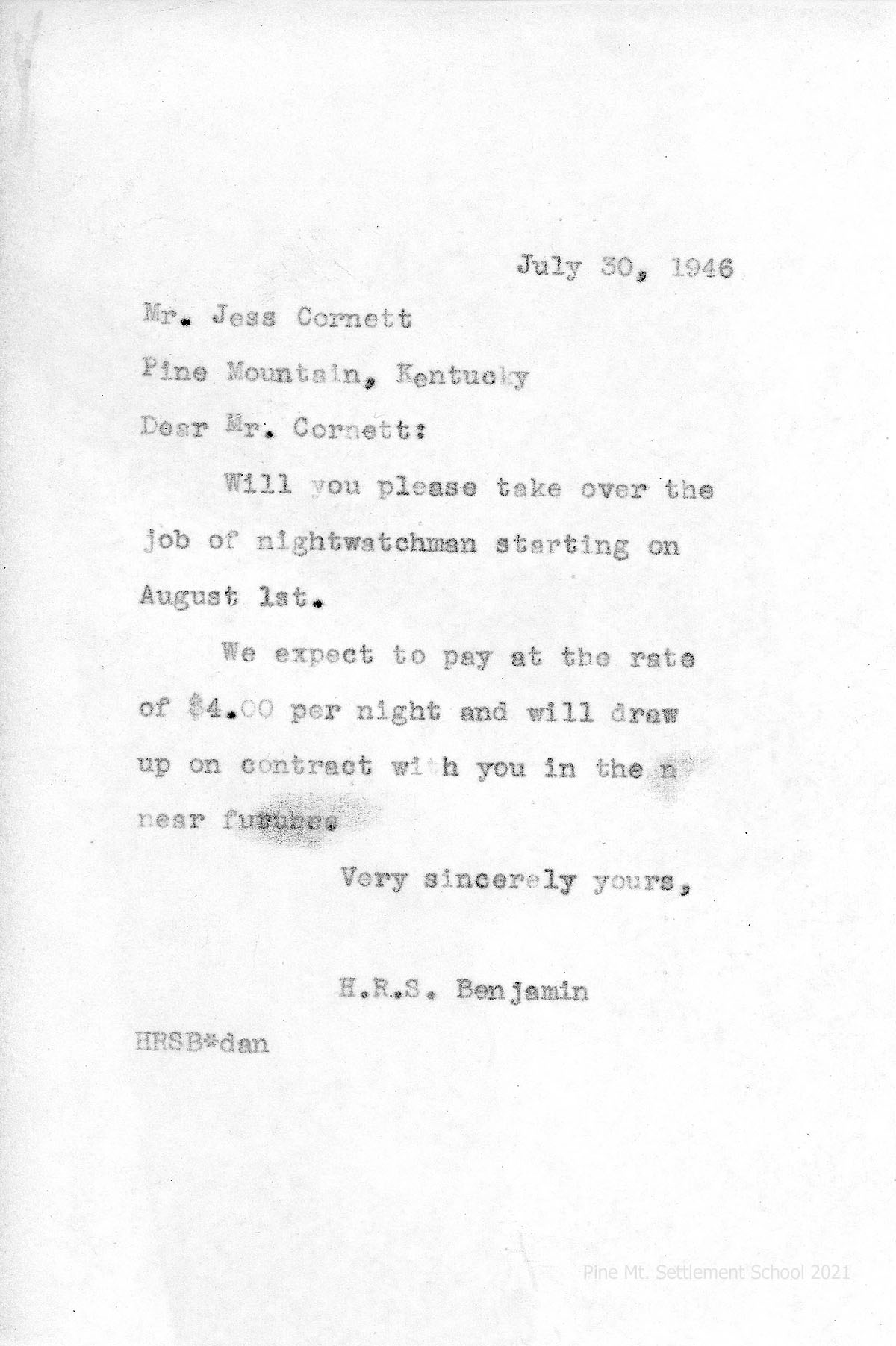 008 July 30, 1946. To Mr. Jess Cornett from H.R.S. Benjamin, asking Jess to assume the job of nightwatchman beginning August 1 at $4.00 per night.