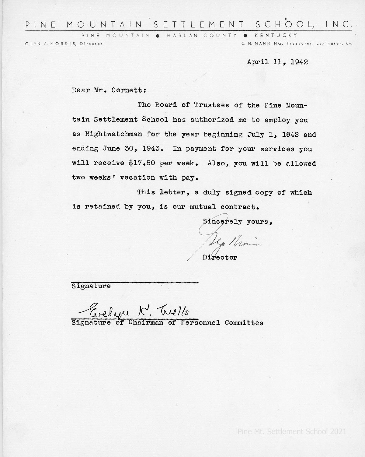 004 April 11, 1942. Contract on PMSS letterhead to employ Jess Cornett as nightwatchman for July 1, 1942 through June 30, 1943, at $17.50 per week and with two weeks’ paid vacation. Signed by Glyn Morris, Director, and Evelyn K. Wells, Chairman of Personnel Committee.