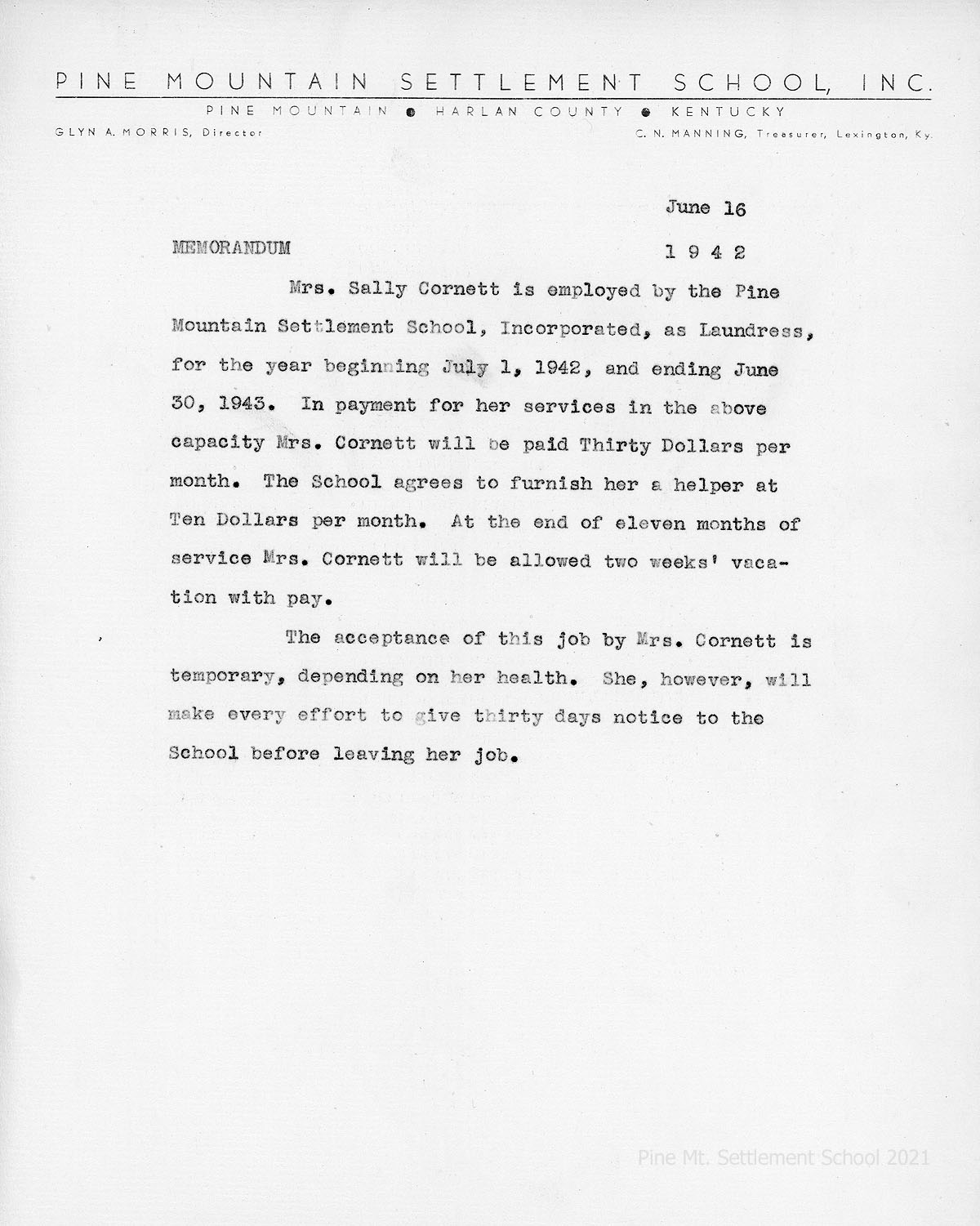 005 June 16, 1942. Contract on PMSS letterhead to employ Mrs. Sally Cornett as laundress for July 1, 1942 through June 30, 1943 at $30 per month and a two weeks’ paid vacation. A helper will be furnished at $10 a month.