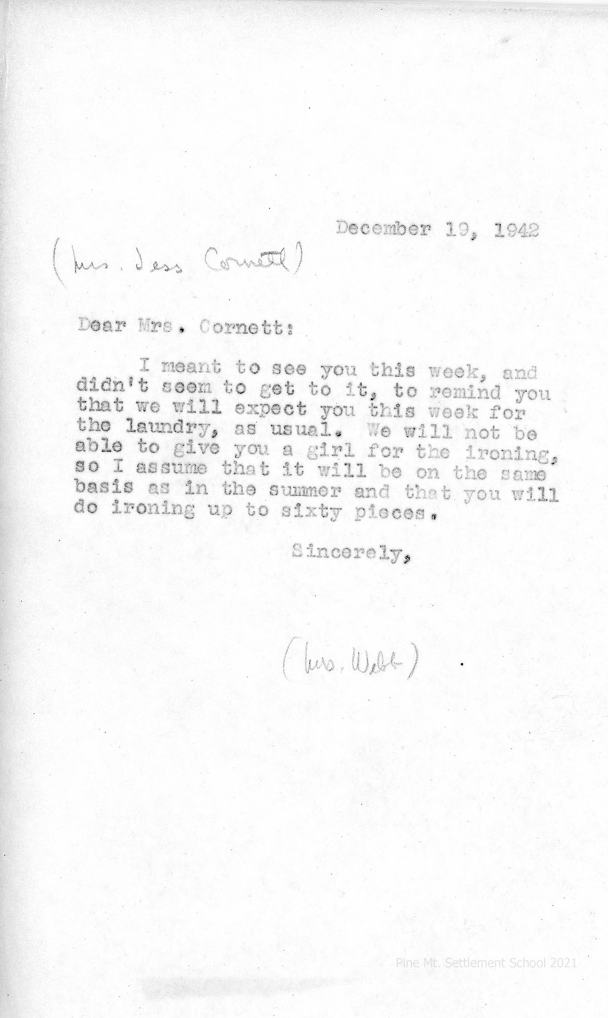 006 December 19, 1942. To Mrs. Jess Cornett from [unsigned – handwritten notation indicates “Mrs. Webb.”], stating that Mrs. Cornett is expected for laundry work as usual. No girl will be furnished for the ironing. So Mrs. Cornett will iron up to sixty pieces.