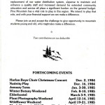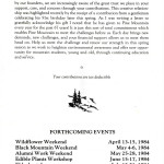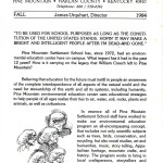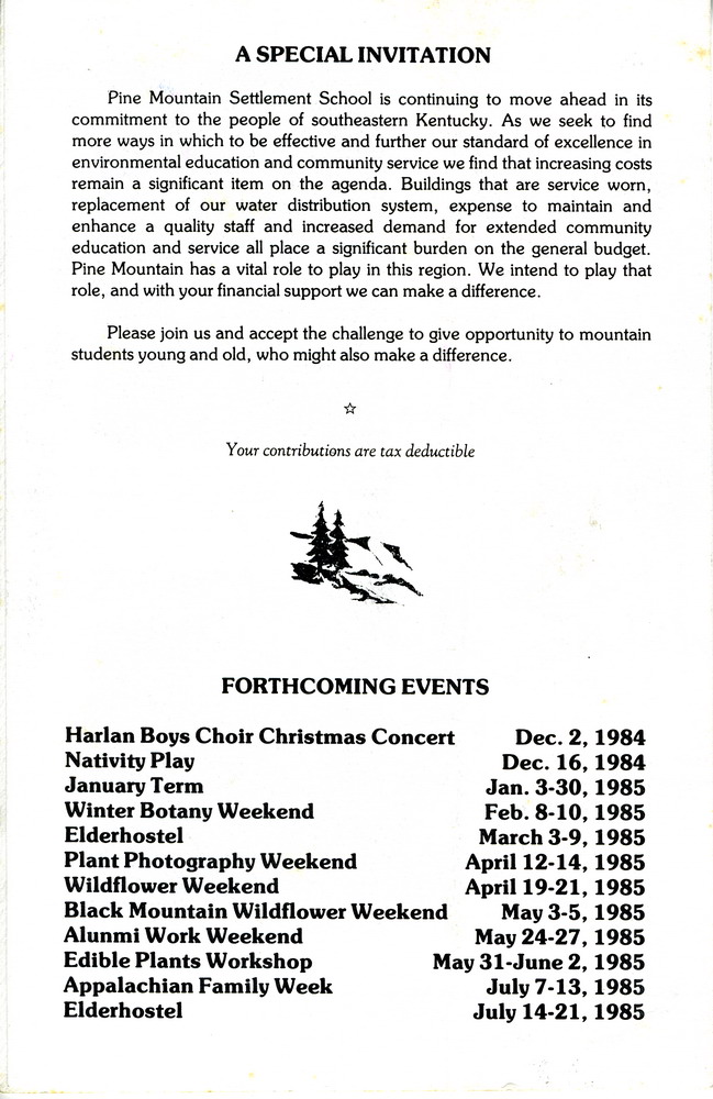 NOTES – 1984 SPRING: drawings ; Sammy Fong ; Joseph Fort Newton ; photographs ; Laurel House ; fundraising suppers ; Harlan Boys Choir ; Berea College Country Dancers ; youth country dance group ; workshops ; costume parties ; West Wind ; snow party ; playground ; needs ;