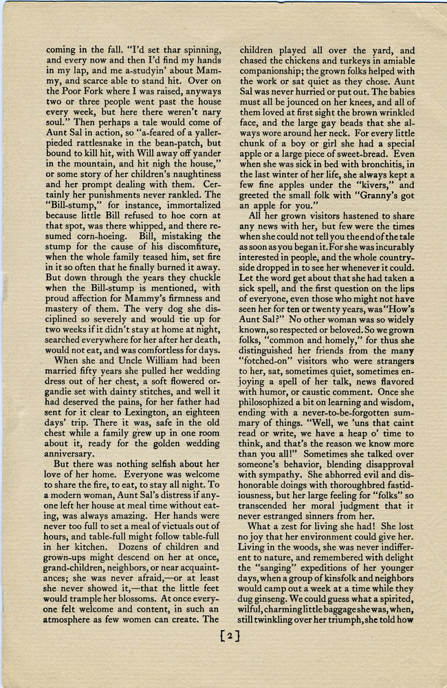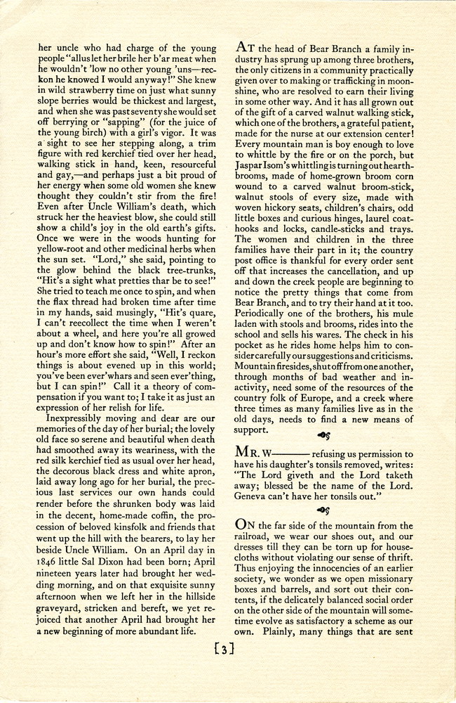 NOTES – 1925 OCTOBER: death of Aunt Sal ; Poor Fork ; clinics ; whittling ; hearth brooms ; crafts ; Bear Branch ; William Creech ; Jaspar Isom ; Canon Barnett ; clothing donations ;