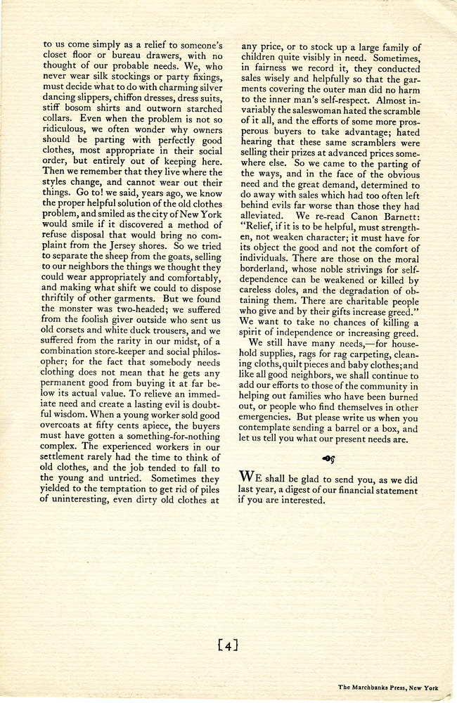 …[M]any [donated] things that are sent to us come simply as a relief to someone’s closet floor or bureau drawers, with no thought of our probable needs. We, who never wear silk stockings or party fixings, must wonder what to do with [them]….