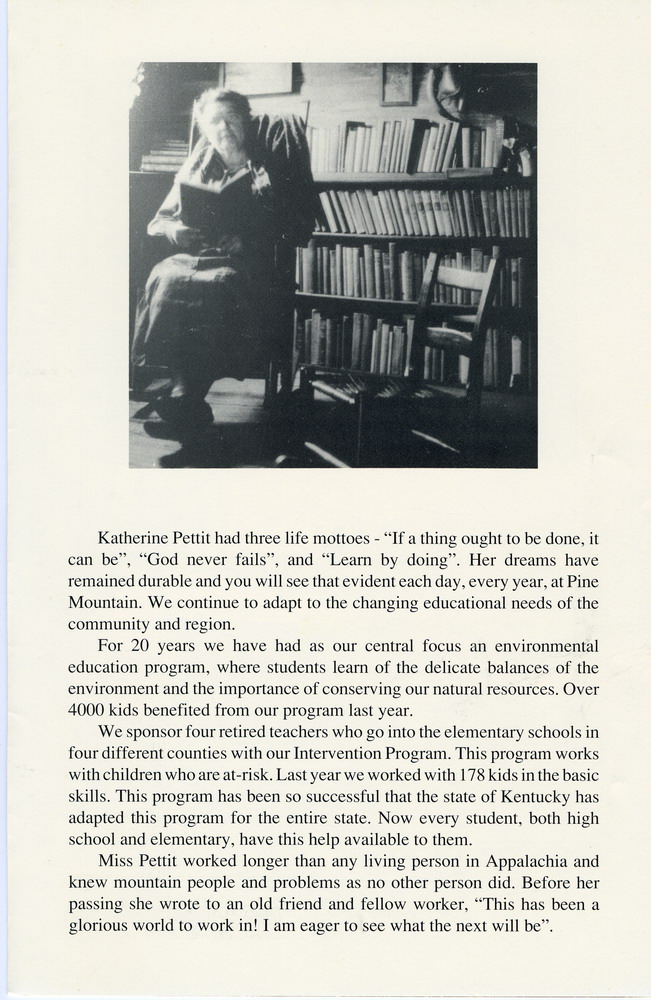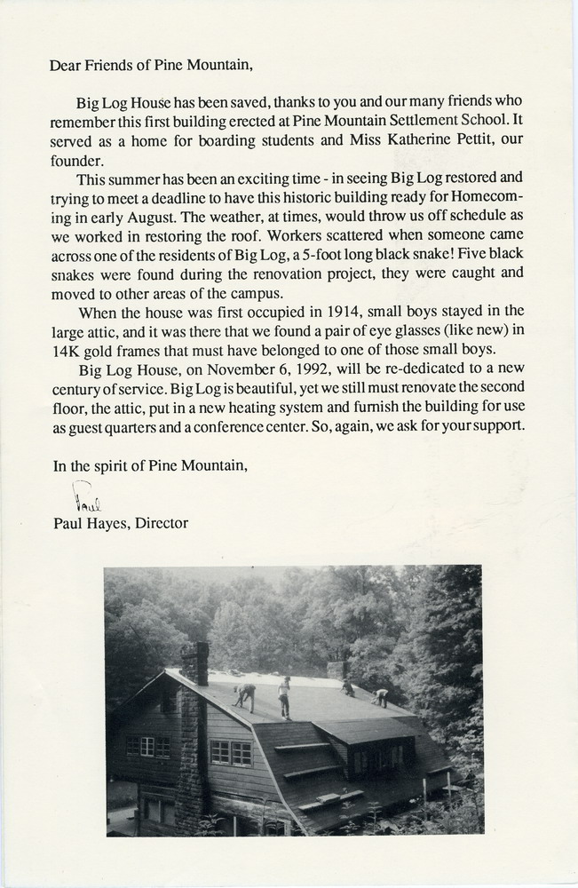 NOTES – 1992 APRIL: Kentucky Bicentennial ; Bicentennial Commission ; Big Log ; renovation ; restoration ; Trustees ; history ; Katherine Pettit ; construction ; photographs ;