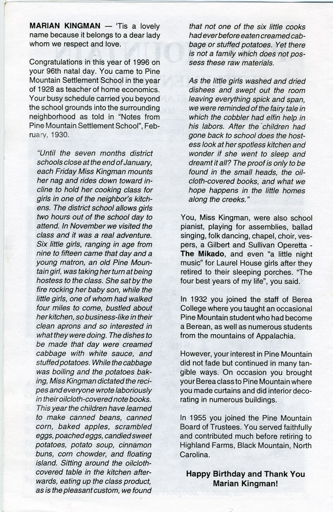NOTES – 1996 SPRING: Marian Kingman ; biography ; The Mikado ; Margaret Motter, Harriet Crutchfield Orndorff ; Advisory Board ; Serene Collmus ; Dwight Collmus ; Rachel Quynn Knudson ; Burton Rogers ; Trustees ; Paul Hayes ; Robert Springer Hoskins ; photographs ;