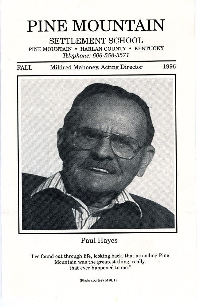 NOTES – 1996 FALL: Paul Hayes obituary ; Fair Day ; World War II ; Mattie Ellen Ayers ; alumni ; infrastructure ; repairs ; Environmental Education ; Big Log ; Far House ; Intervention Program ; community ; financial stability ; photographs ; drawing ; Trustees ;