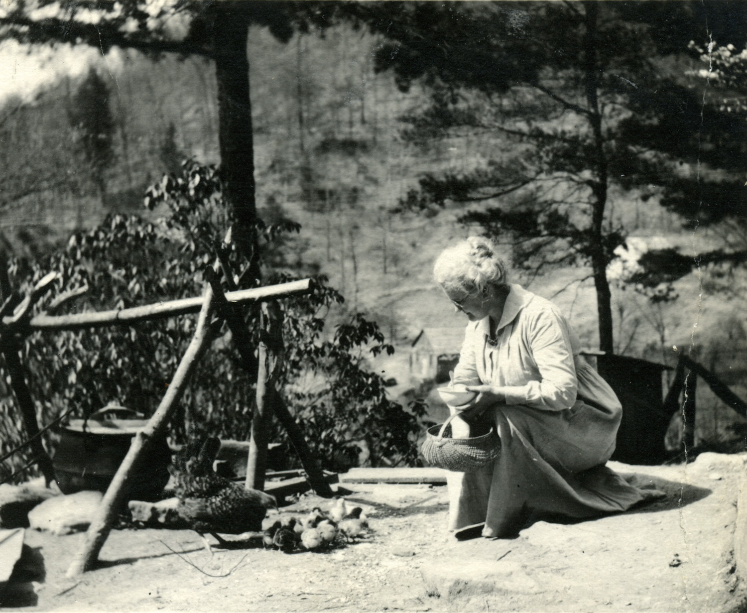 Harriet Butler feeding chicken and chicks at iron pot cooker at Medical Settlement, Big Laurel. X_099_workers_2497_mod.jpg