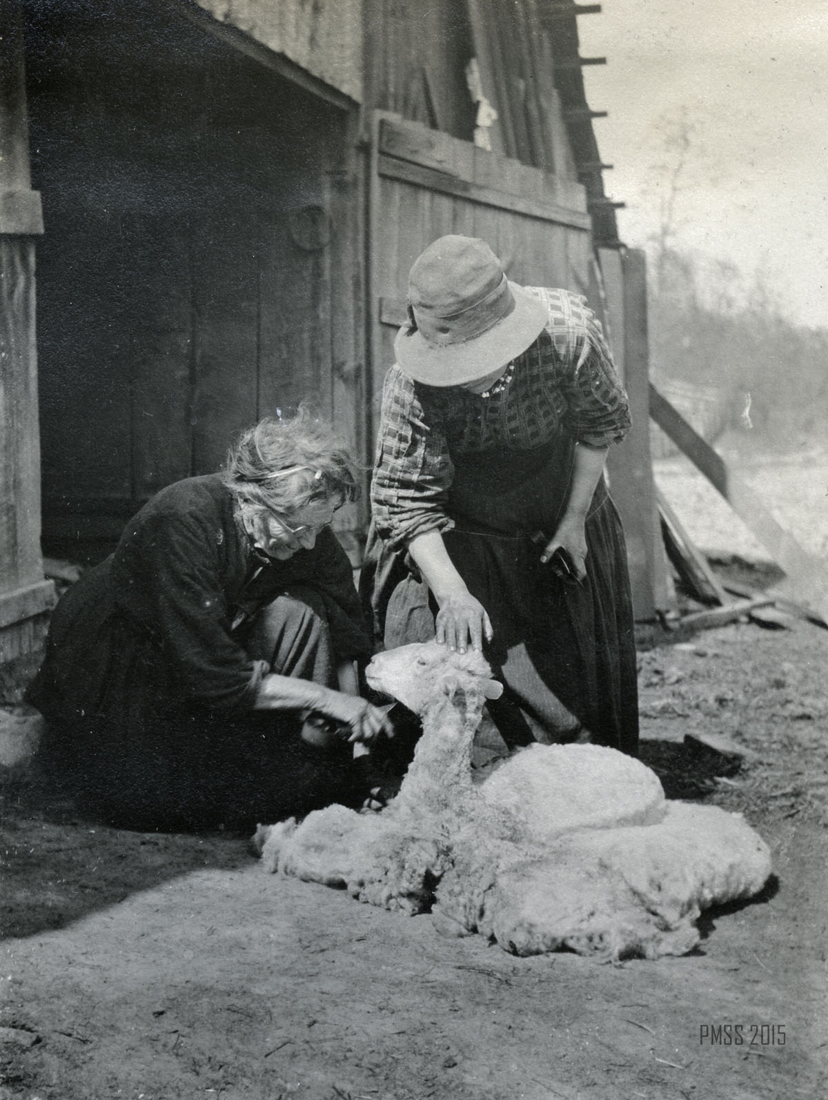 - 0047a P. Roettinger Album. [Aunt Sis and Mrs. Joe Day sheering a sheep, barn at left.]