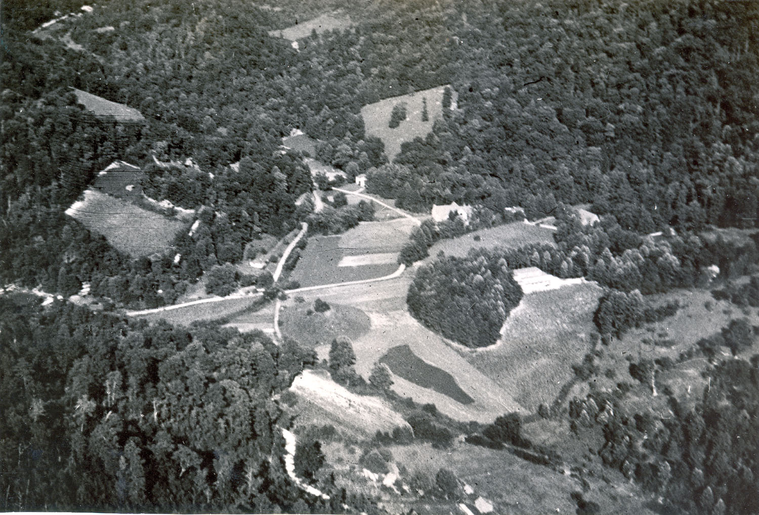Aerial view of Pine Mountain Settlement School c. 1941. Westwind is just under construction as the white patch to the right of the photograph. Again, cultivated fields stand out against the heavily forested area around the school. Today, most of the fields are overgrown with young timber and the cultivated land has been reduced to the central areas of the campus at the middle of the photograph. Photo, Arthur Dodd.