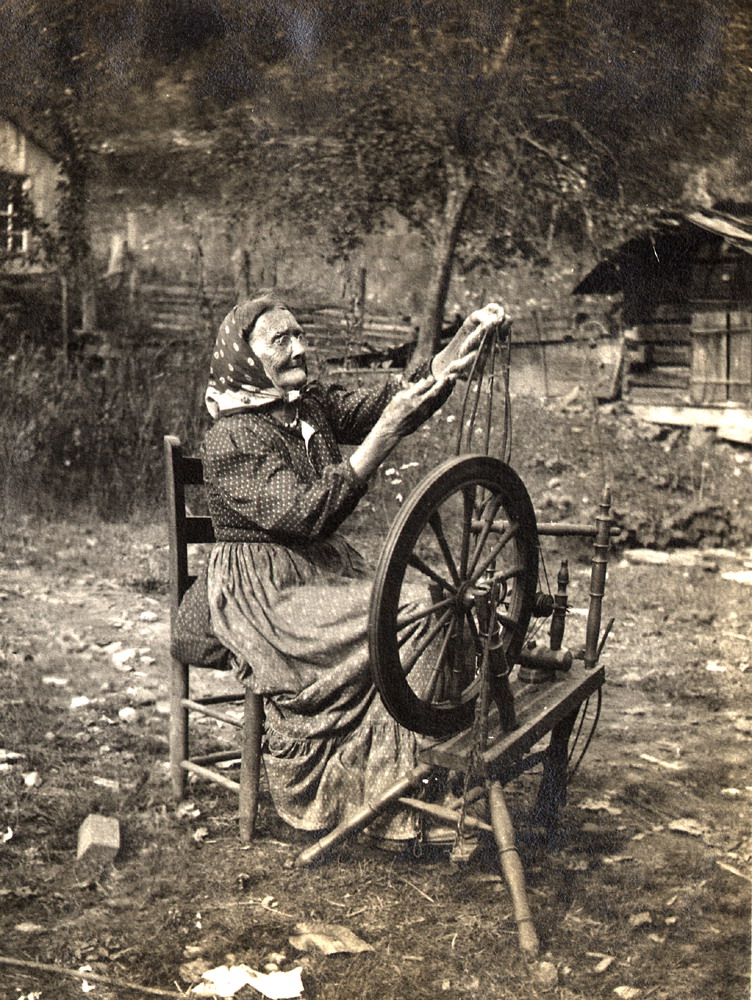 A Pine Mountain neighbor with her spinning wheel. c. 1915.