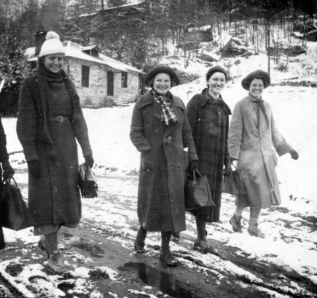 We knew when we came off the mountain onto the road by Manon Cornett‘s store, but after that, we really began to be worried for fear we had missed the Cabin — it was about ten o’clock by this time, and of course there wasn’t a sign of a light anywhere along the way, and it a pitch black night, But we watched carefully, and finally, after much longer time than I thought, we came to the gate. It was so good to get there. Miss Cold [Edith Cold]and Miss Merrill [Josephine Merrill] were waiting up for us, and they were happy to see us, such a cordial homecoming greeting! We couldn’t let Frank go back that long way home again, so he stayed at the Cabin. We almost fell into bed — so weary — and morning came in about two minutes.